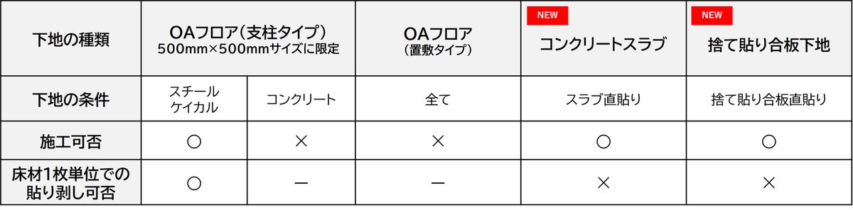 コンクリートスラブ下地・捨て貼り合板下地は貼り剥がし不可。