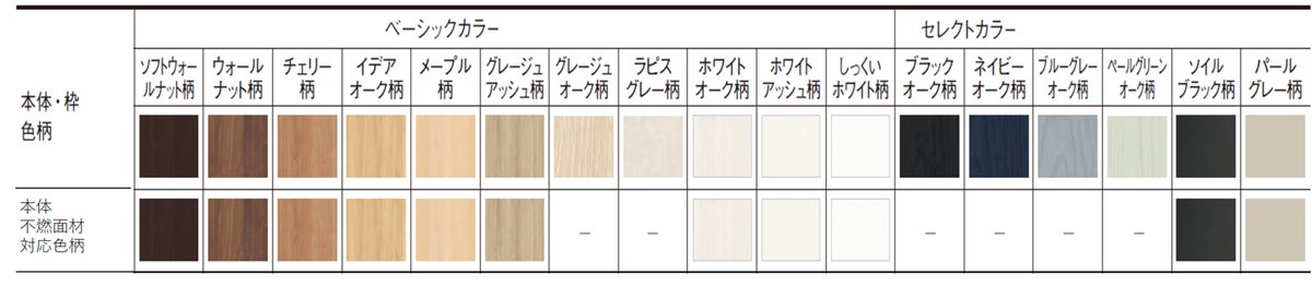 色柄はインテリア建材ベリティスと同じ全17柄と、不燃面材対応柄11柄に対応。空間の雰囲気や用途に合わせて、幅広いインテリア提案が可能です。