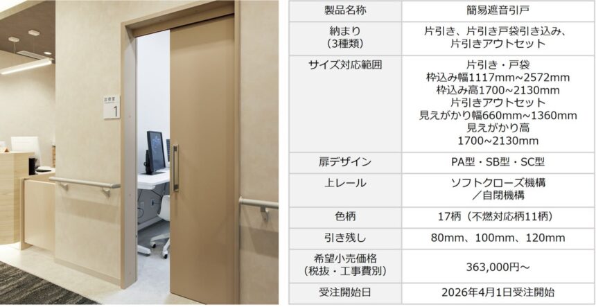 パナソニック ハウジングソリューションズ株式会社(代表取締役 社長執行役員:山田 昌司、本社:大阪府門真市、以下、当社)は、遮音性能が求められる病院やクリニックなどの診察室に適した「簡易遮音引戸」を2026年4月1日から受注開始(※1)します。