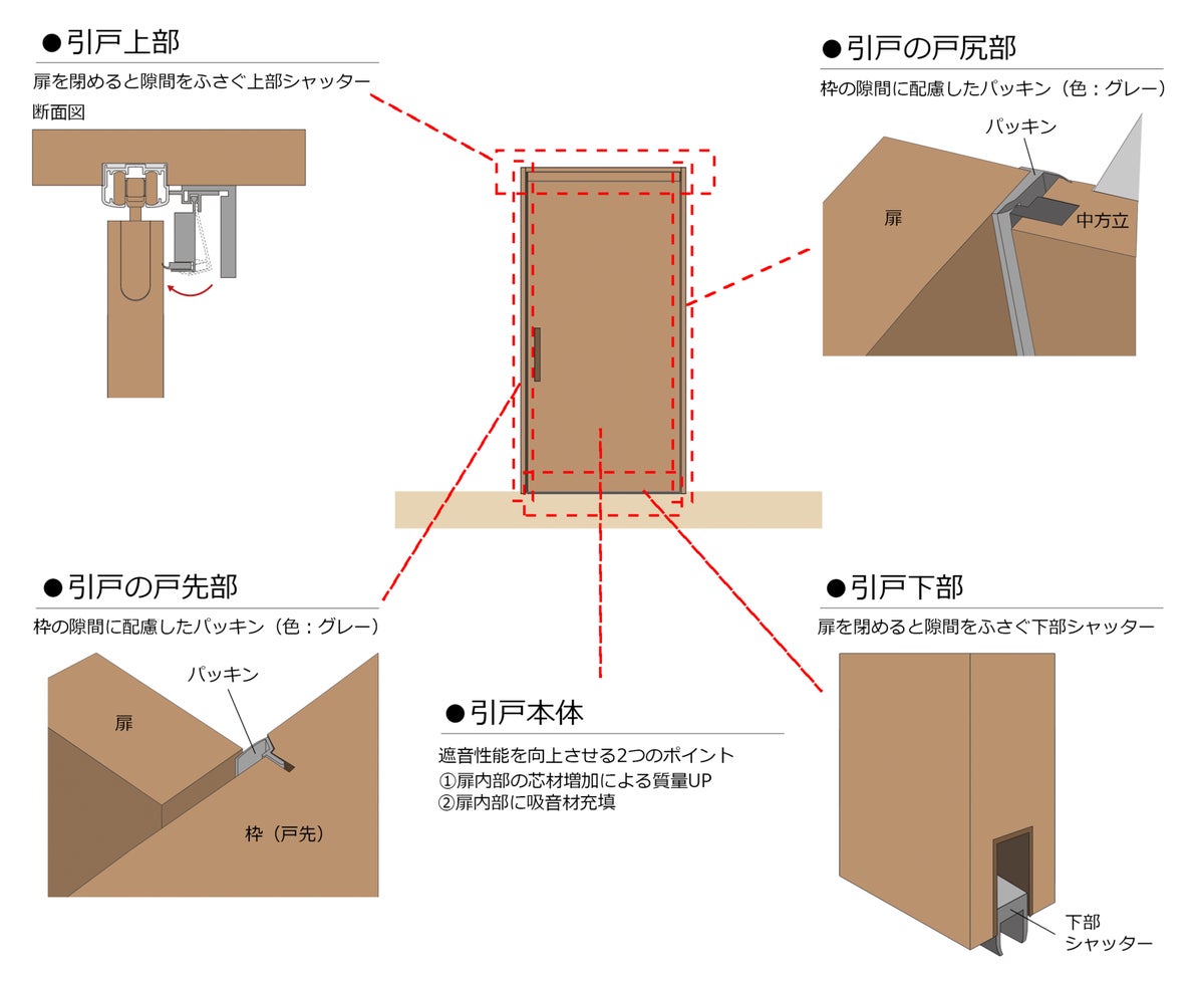 病院の診察室や個室など、音漏れが気になる場所でも、一般的な話し声をささやき声程度に低減できる遮音性能(T-1等級)(※2)を確保しています。遮音構造として、扉を閉めると引戸上部には隙間をふさぐ「上部シャッター」、引戸下部には床面との隙間をふさぐ「下部シャッター」があり、戸先・戸尻部分の隙間には「パッキン」を施しています。また、引戸本体には芯材を増やして質量を高め、吸音材を充填することで遮音性を強化しています。