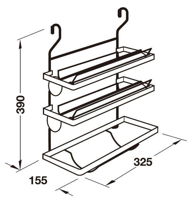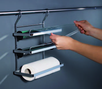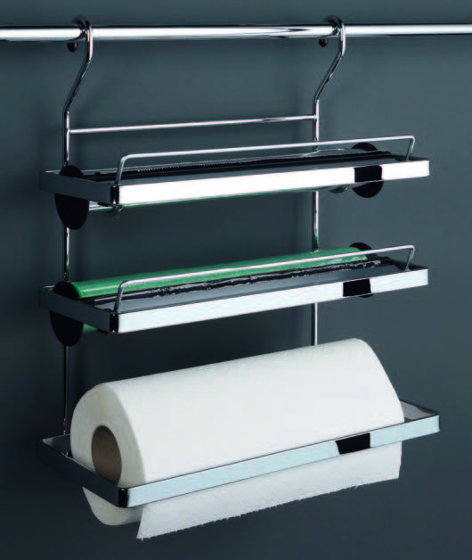 説明 【商品仕様】 ・Ø16mmレール用 ・キッチンペーパー、アルミホイル、ラップ用 ・上2段にはカッティングエッジ付 ・サイズ:(W)325x(D)155x(H)390mm ・材質/仕上:スチール、クロームメッキ