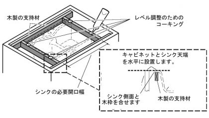 この方法はアンダーシンクの現場取付方法にもなります。桟木でシンクをL金物を支持しシンクをビス止めで固定する方法です。
