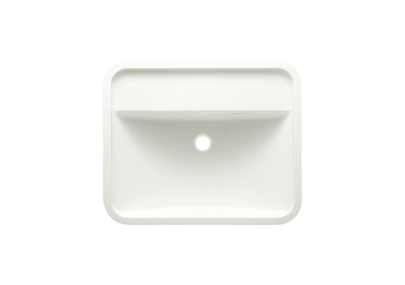 コーリアン®のワークトップに美しくフィットするラバトリーボウル。シームマウントなら、カウンターと一体的に仕上げられます。