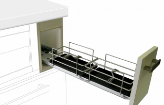 キッチンベースキャビネットにビルトインする収納メカです。引出し式や回転式も